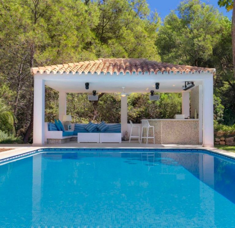 The three bedrooms are designed for restful nights, each with a double bed and fitted wardrobes. The master suite features its own en-suite bathroom, while the other two bedrooms share a modern shower room. One bedroom opens to a terrace with mountain views, while another overlooks the pool and gardens, bringing the outdoors in.