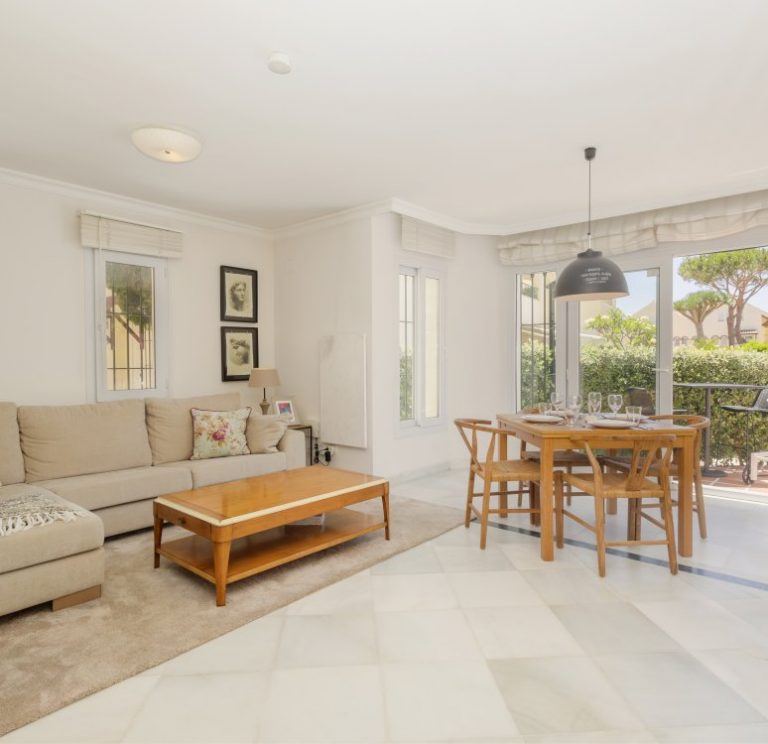 Built on one level, the apartment has direct access from every room to a spacious terrace and a private fenced garden, where you can enjoy an outdoor sofa with armchairs, a coffee table, dining set for four, and two sun loungers—ideal for soaking up the Andalusian sun.